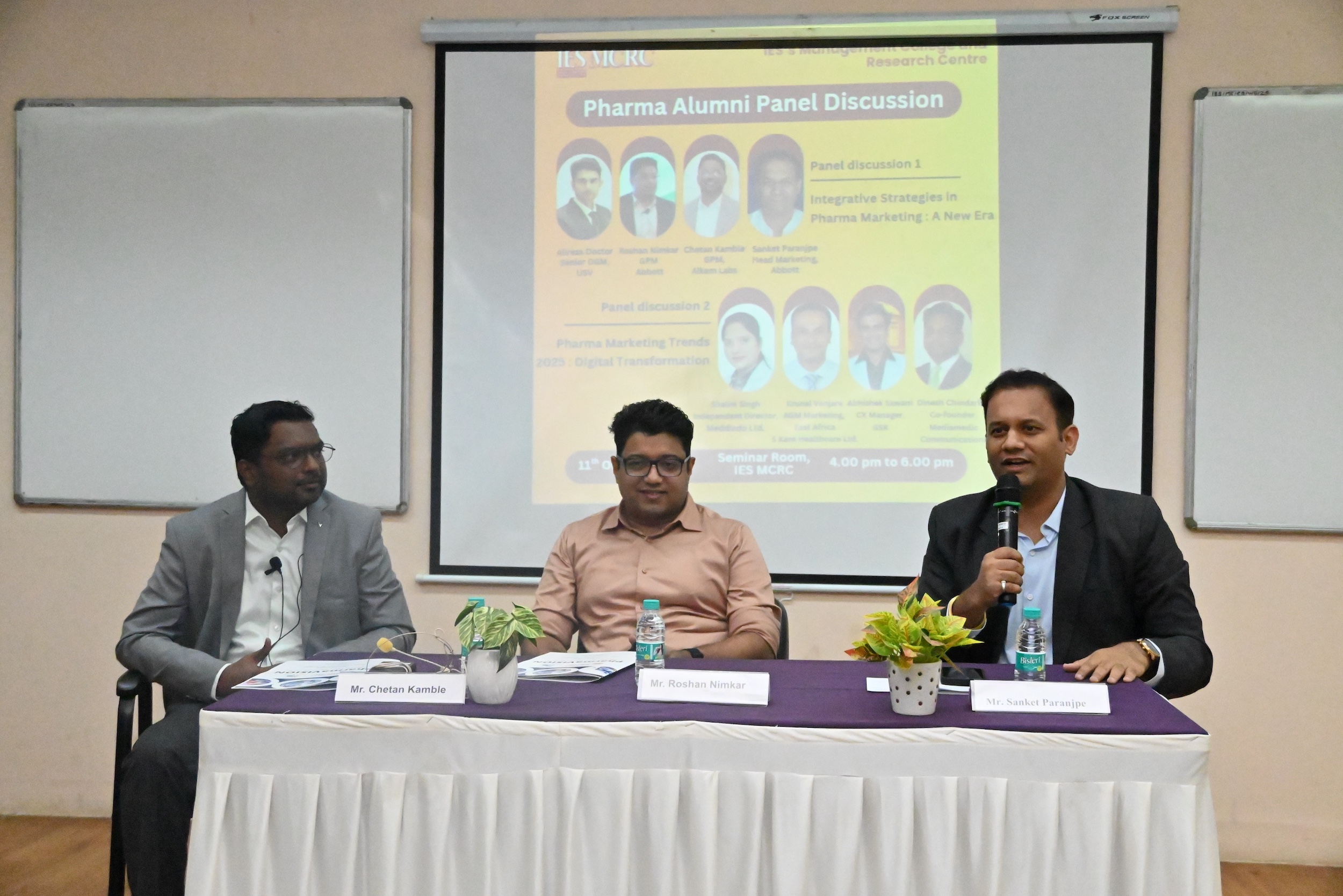 IESMCRC organized a Pharma Alumni Panel Discussion on Saturday, 11 October 2025, at Seminar Hall 601, for first- and second-year Pharma students, with around 50 participants. The event focused on Indian Innovative Strategies in Pharma Marketing: A New Era. Panel 1 featured Mr. Alireza Doctor (USV), Mr. Roshan Nimkar (Abbott), and Mr. Chetan Kamble (Alkem Labs), who shared insights on evolving pharma marketing strategies. Panel 2, themed Pharma Marketing Trends 2025: Digital Transformation, included Ms. Shalini Singh, Mr. Abhishek Sawant, Mr. Krunal Vanjara, and Mr. Dinesh Chindarkar. The discussions highlighted real-world examples and case studies. The session concluded with an interactive Q&A, benefiting students through practical industry perspectives.